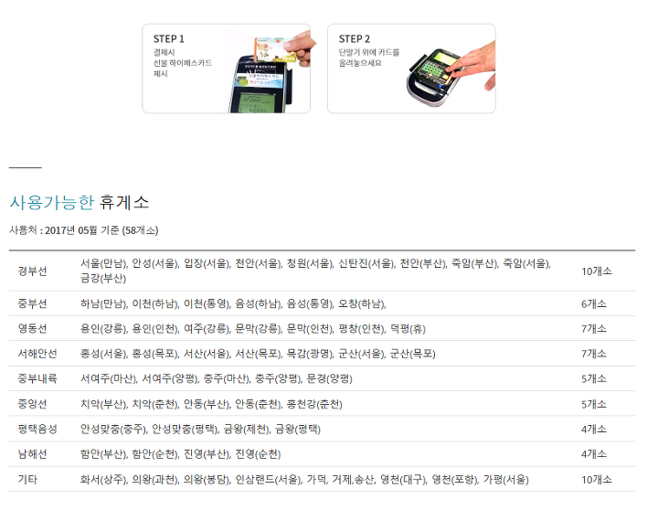 또 이 하이패스카드는 우리가 일반적으로 알고 있는 고속도로 말고 휴게소 혹은 주차장 등에서 현금 대신 활용할 수 있는데요. 결제를 할 때 전용 카드를 제시하고 나서 올려놓고 나면 됩니다. 이게 되는 휴게소 종류를 한번 확인해보세요. 전국에 58군데가 현재 되는 것 같습니다.