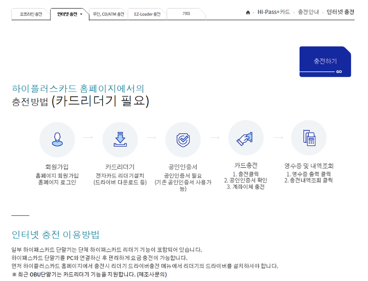 또한 온라인을 통해서도 카드 금액을 충전할수 있습니다. 대신 이때는 하이플러스 홈페이지 가입을 해야 하며, 전용 카드리더기 설치를 해야 하고 공인인증서까지 3개가 있어야 합니다. 이를 통해 카드결제를 하고 나면 나중에 영수증을 받을 수도 있습니다.
