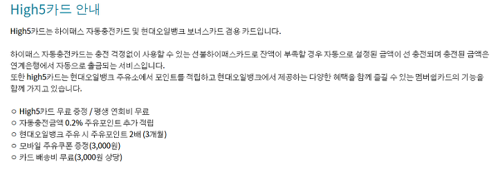 그리고 보면 알겠지만 연회비가 따로 없는 상품이기도 합니다. 앞에서도 살짝 언급을 했지만, 현대 오일뱅크 등지에서 주유를 하는 경우에 이것 관련된 포인트가 두배로 되거나 (3개월), 추가로 적립이 되는 기능 역시 되어 있습니다.