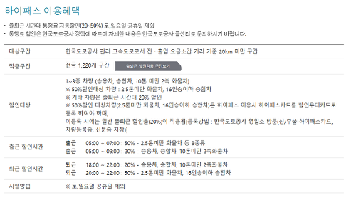 이때 이 후불 하이패스카드를 이용하게 되면 관련된 혜택이 있다고 알려져 있는데요. 많은 분들이 이용하는 출퇴근 시간대에 이 카드를 이용하게 되면 20%에서 최대 50%까지 할인이 된다고 해요. 대신 이때 공휴일에는 적용이 되지 않습니다.