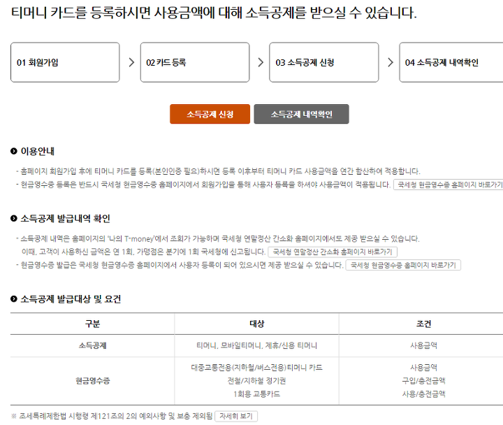 이 t머니 교통카드는 나중에 따로 등록을 하면 여러 가지 지원이 있다고 알려져 있는데요. 그중에서도 가장 큰 게 소득공제 내용이 아닐까 싶습니다. t머니 교통카드의 연간 금액을 따로 합산해서 뒤에 적용이 됩니다. 기타 이것 말고도 현금영수증 관련된 혜택을 지원받는 것 역시 가능합니다.