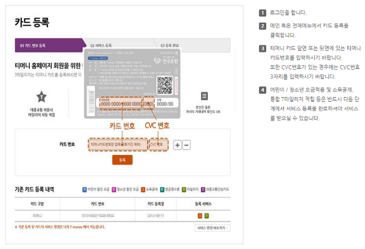 그럼 구체적으로 t머니 교통카드는 어떤 식으로 등록을 하는 걸까요? 먼저 앞에서 말한 교통카드를 따로 구매하고 나서 그 뒤에 있는 카드번호와 cvc 번호를 확인한 뒤에, 관련 계정에 추가해서 사용하면 됩니다. 이 뒤에는 t머니의 대부분의 서비스를 이용할 수 있어요.
