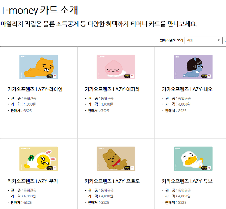 t머니 카드 소개 부분을 보면 이를 확인할 수 있습니다. 이는 현재 카카오프렌즈를 비롯해서 포켓몬이나 라인 프렌즈 등의 다양한 시리즈가 있습니다. 이는 대부분 gs25 편의점에서 판매를 하며, 이것 말고도 cu나 미니스톱 같은 곳도 기본 형태의 교통카드는 다 판매를 하고 있어요.