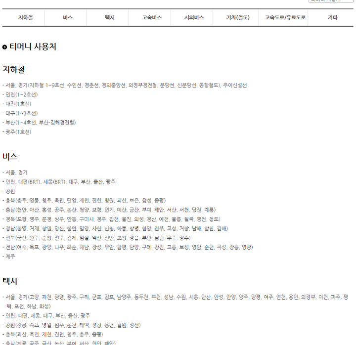 기타 기본적인 교통카드 기능 역시 버스나 지하철 말고도 다양한 곳에서 활용할수 있는데요. 택시를 비롯한 기차 그리고 고속도로 등지에서도 이 교통카드를 현금 대신 활용하는 게 가능합니다. 대신 이는 지역마다 다르기 때문에 자세한 사항은 t머니 홈페이지를 통해 확인해보세요.