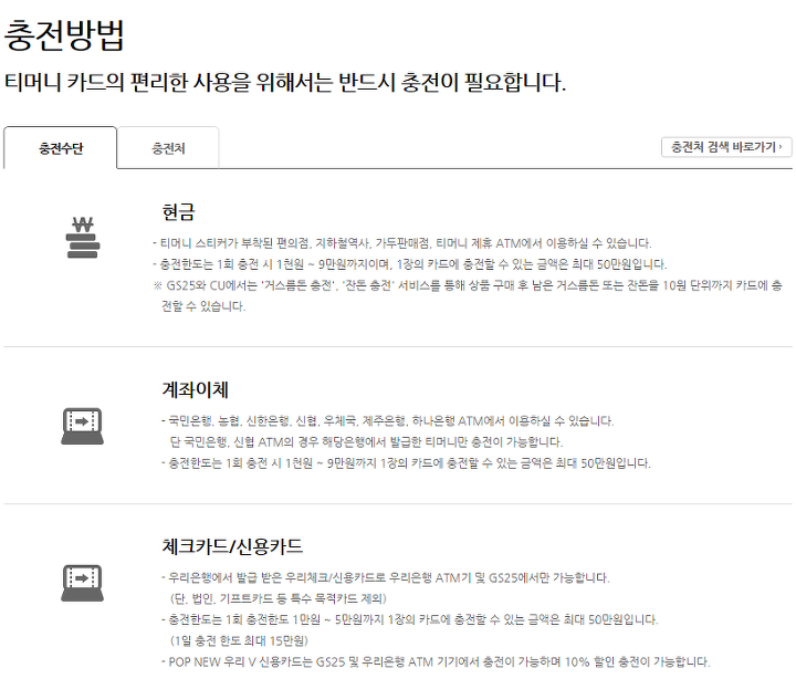 또 t머니 교통카드는 일정 금액을 충전하는 방식인데, 이것은 앞에서 말한 구입처 등지에서 현금으로 해도 되며, 계좌이체나 체크카드 혹은 신용카드를 통해서도 할 수 있습니다. 기타 평소에 가지고 있는 통합 마일리지 등을 통해서 하는 것 역시 가능합니다.