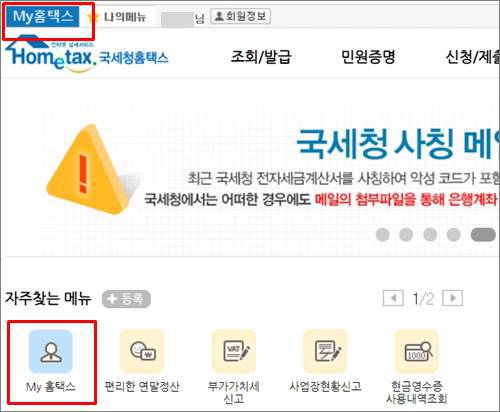 공인인증서로 로그인하면 상위의 왼쪽 파란버튼의 My홈택스 또는 아래 자주찾는 메뉴의 My홈택스를 누르면 됩니다.