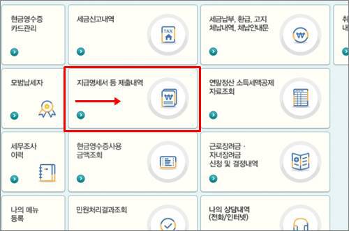My홈택스에 들어오면 중간에 보이는 지급명세서 등 제출내역을 누릅니다.