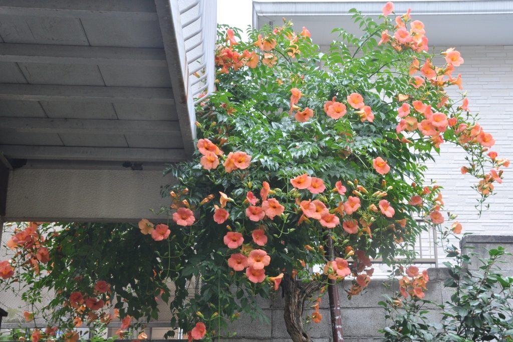 능소화는 담쟁이덩굴과도 비슷한 성장 양식을 가지고 있습니다. 줄기의 마디에 생기는 흡착 뿌리(흡반)를 이용해 건물의 벽이나 다른 물체에 지지하여 높은 곳으로 자라납니다. 가지 끝에서 나팔처럼 벌어진 주황색의 꽃은 여름에서 가을에 걸쳐 화사하게 피어나며 아름다운 풍경을 연출합니다. 능소화는 또한 꽃말로 그리움과 기다림을 담고 있습니다.