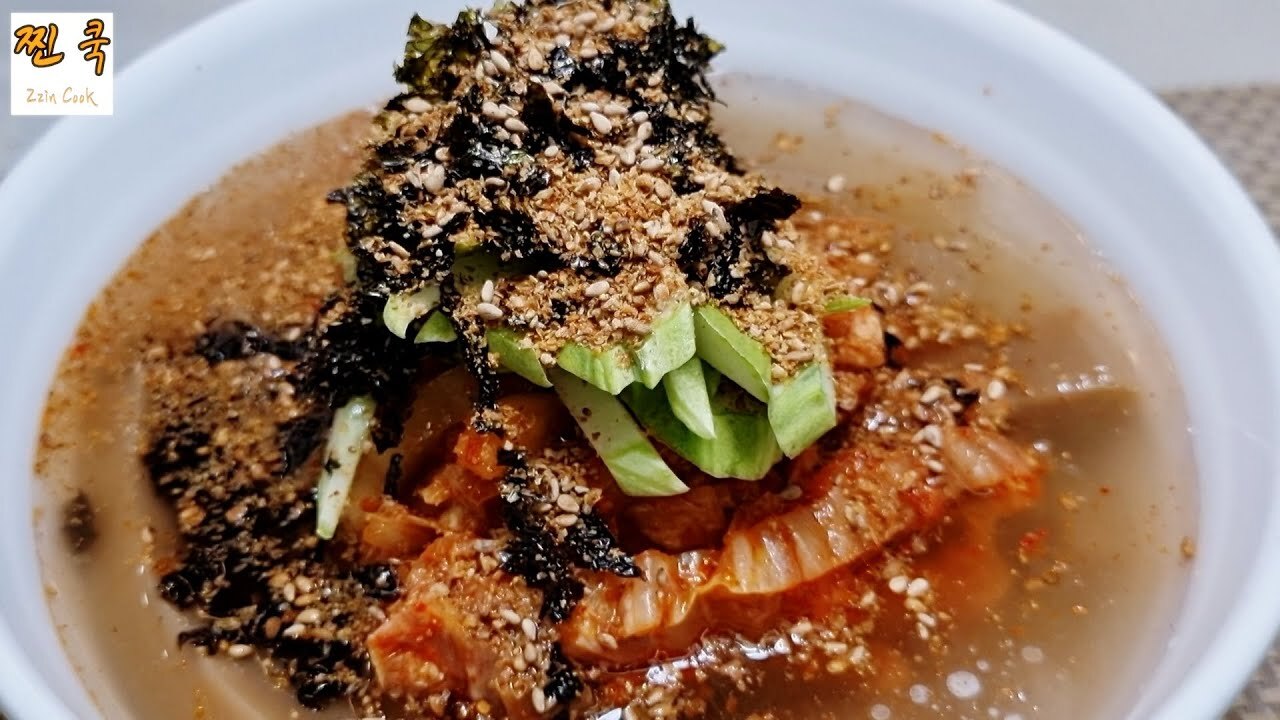 - 시원한 육수를 부어주고 김가루와 쪽파를 솔솔 뿌려주며 통깨 1스푼을 갈아서 올린다.