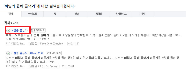 검색 결과 확인: 가사를 입력한 후에는 엔터를 눌러 검색을 실행합니다. 그러면 네이버 뮤직이 입력한 가사와 일치하는 노래를 검색 결과로 보여줍니다. 검색 결과에서 원하는 노래를 찾아 클릭합니다.