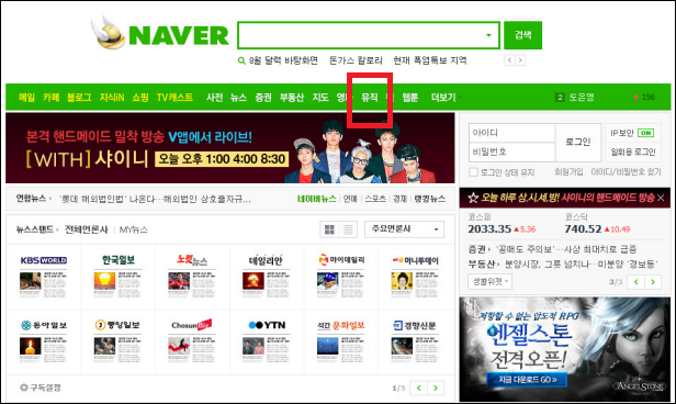 뮤직 카테고리 선택: 네이버 뮤직 사이트에 접속하면 화면 상단의 메뉴에서 "뮤직" 카테고리를 선택합니다.