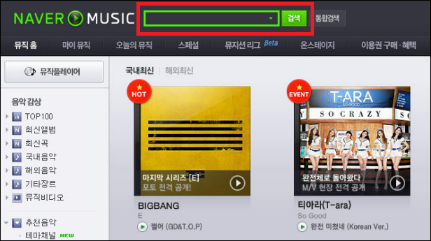 검색창 이용하기: "뮤직" 페이지로 이동하면 검색창이 나타납니다.