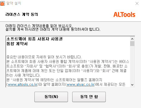 다운로드 버튼을 클릭하면 알약 설치 파일이 컴퓨터에 저장됩니다. 다운로드가 완료되면 해당 파일을 실행하여 설치를 시작합니다. - 라이선스 계약 동의