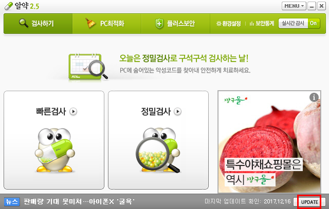 알약은 윈도우 보안 업데이트 확인 기능을 제공합니다. 이 기능을 사용하면 윈도우의 보안 패치가 최신 상태인지 확인할 수 있으며, 필요한 업데이트가 있으면 이를 다운로드하여 설치할 수 있습니다. - 환경 설정