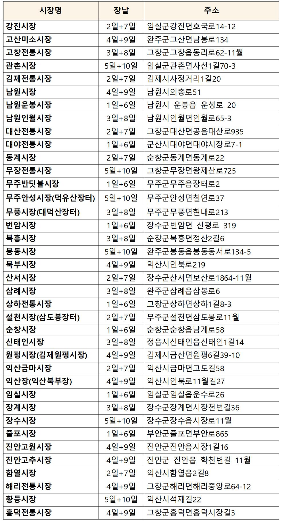 전라북도 5일장 시장 목록 및 장날