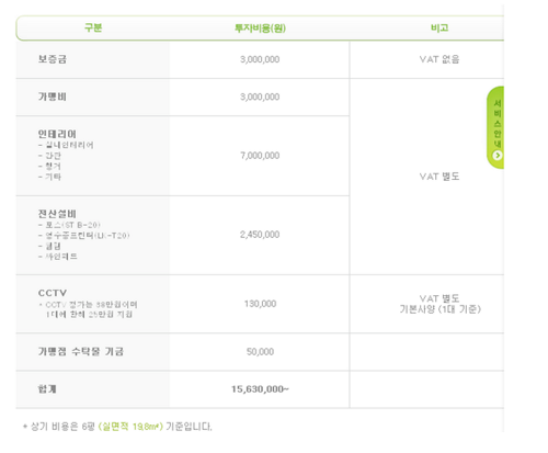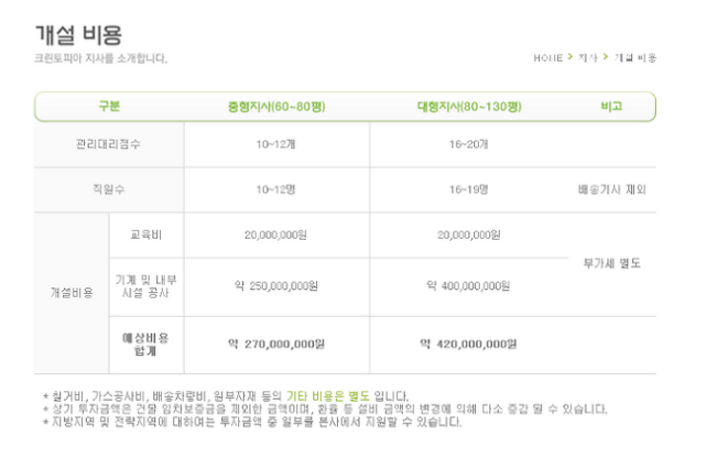 내부 CCTV 설치와 가맹점 수탁물 기금까지 합하면 대략 1,560만원 정도의 비용이 듭니다. 이때 크린토피아 지점의 크기는 6평(약 19.8m²)을 기준으로 합니다.