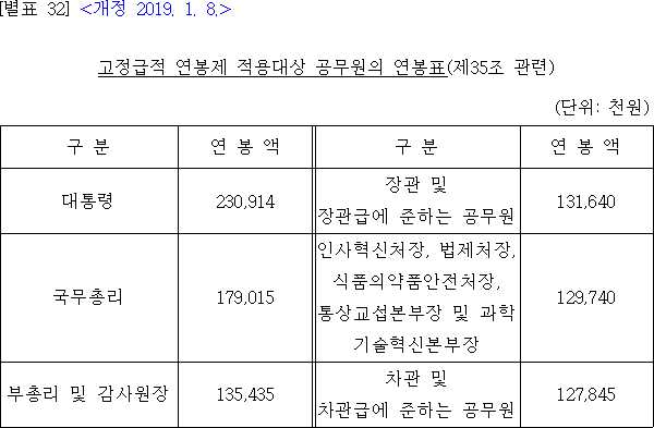 2019년 일반직 공무원 봉급표 및 대통령 연봉