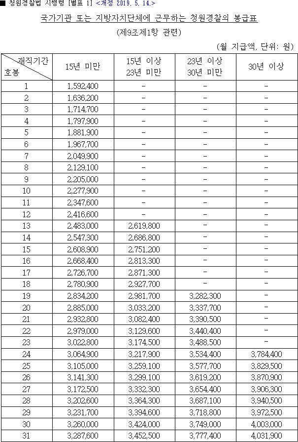 아래는 참고용 2019년 청원 경찰 봉급표